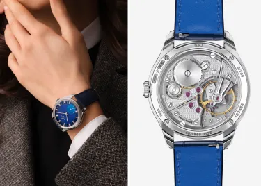 Blue, Zenith’s signature color, takes center stage in three watches celebrating the house’s 160th anniversary. Among them, the G.F.J. stands out with a deep-blue lapis lazuli dial, flecked with golden pyrite like a starry sky. This watch pays tribute to the legendary Caliber 135, the most awarded movement in chronometry competitions, with 235 distinctions between 1949 and 1962. Reintroduced for this limited edition of 160 pieces, the manual-winding caliber has been modernized with a 72-hour power reserve and COSC-certified accuracy of ±2 seconds per day.