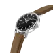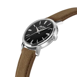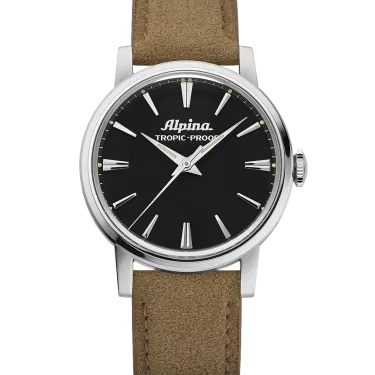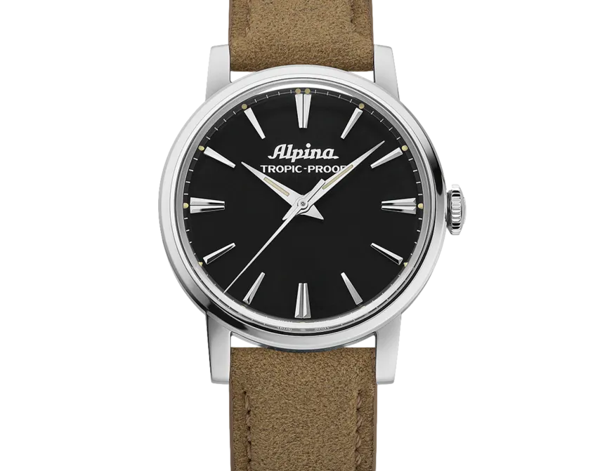 This Heritage model features a 34mm brushed and polished stainless steel case paired with a beige Alcantara strap. Powered by a hand-wound AL-480 caliber, it offers a 42-hour power reserve. The watch displays hours, minutes, and seconds with hand-polished silver color hands and beige Luminova details.