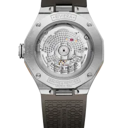 Powered by the prestigious Baumatic calibre movement, the Riviera 10720 is the ultimate Swiss all-terrain watch. Its transparent smoky grey sapphire dial, steel case, microblasted titanium bezel and gold-plated steel ring give this watch character and emphasise its sporty look.