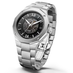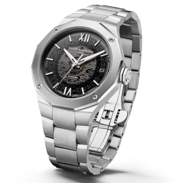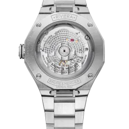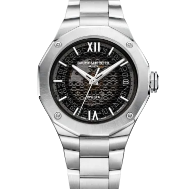 Powered by the prestigious Baumatic calibre movement, the Riviera 10715 is the ultimate Swiss all-terrain watch. Its transparent smoky grey sapphire dial, interchangeable metal bracelet and open case back emphasise the sporty look of this Swiss-made watch.