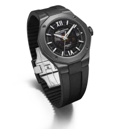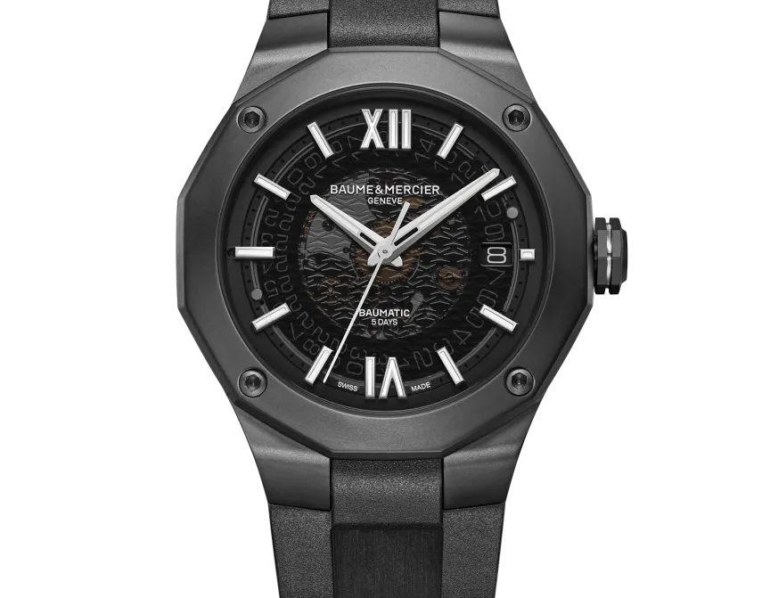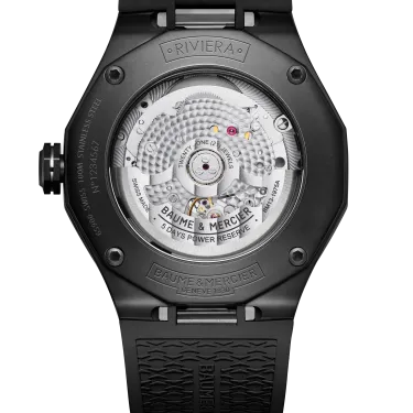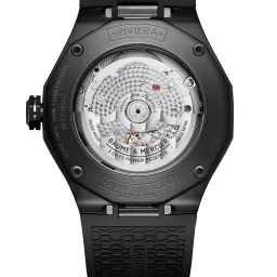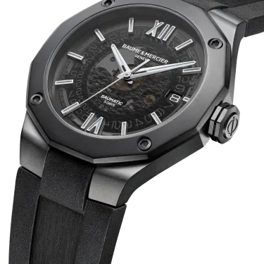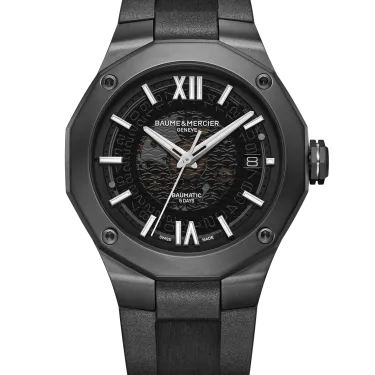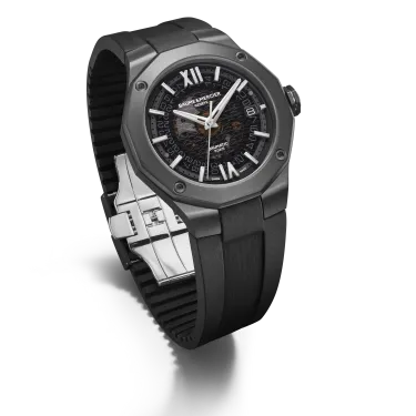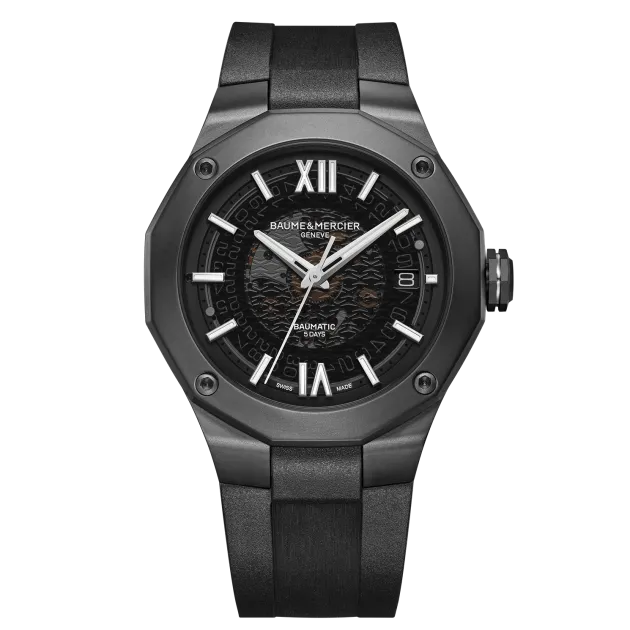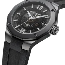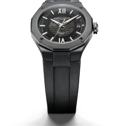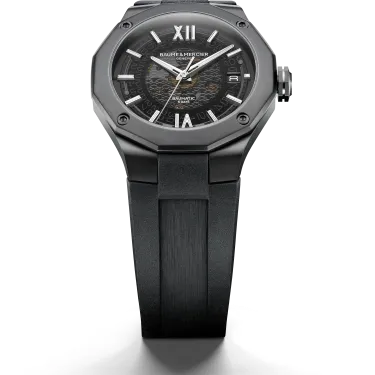 Equipped with the prestigious Baumatic manufacture calibre, the Riviera 10617 is a subtle combination of refinement and sportiness. Featuring a translucent smoked dial and a dodecagonal steel case coated in black ADLC, this distinctive timepiece is adorned with a supple black strap for a bold total black look.