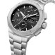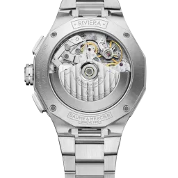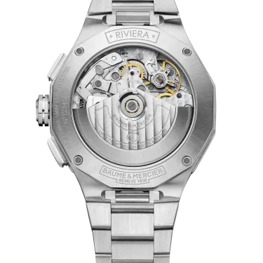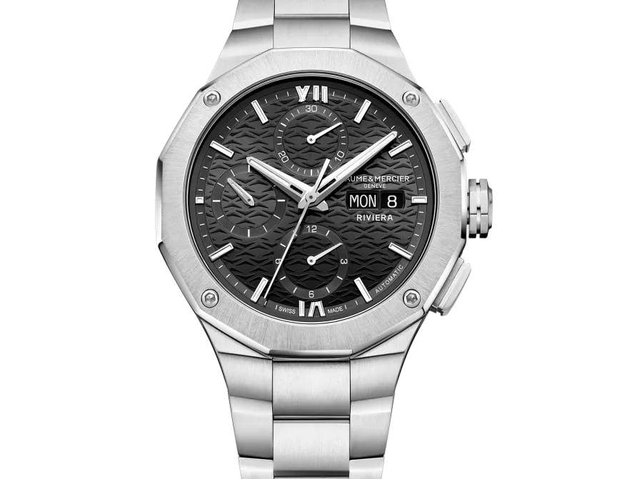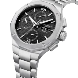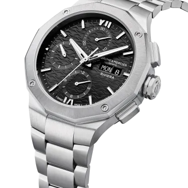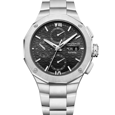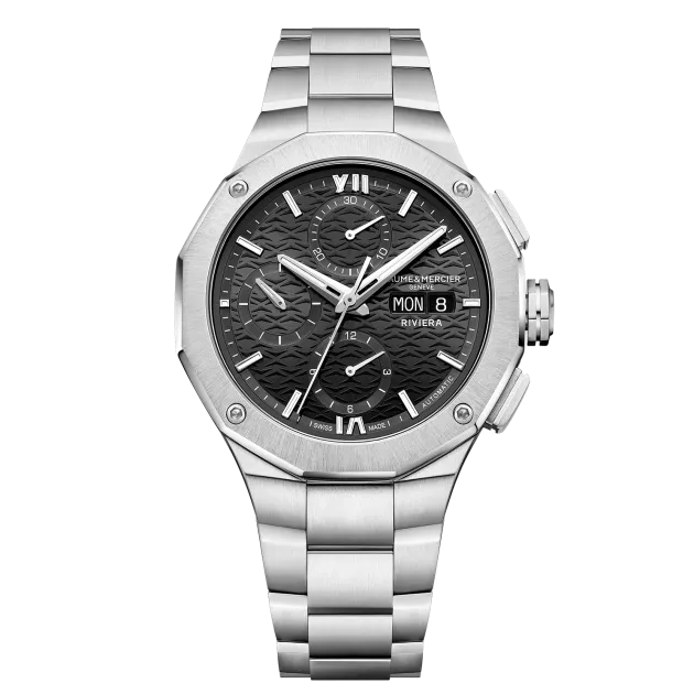 The Riviera Chronograph 10825, inspired by the 43 mm version, joins the collection in a slimmer 41 mm format. Its polished and satin-finished stainless steel dodecagonal case is protected by anti-reflective sapphire crystal. The black dial with a wave pattern, azure-finished flange and counters highlights the Roman numerals, hour markers and rhodium-plated hands enhanced with white Superluminova. It is equipped with an automatic movement with a 48-hour power reserve and 10 ATM water resistance. The interchangeable stainless steel bracelet is equipped with a reliable system that allows it to be changed without tools.