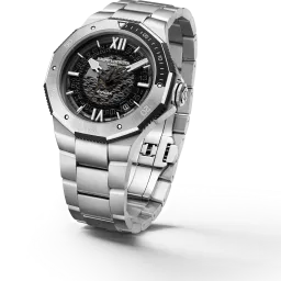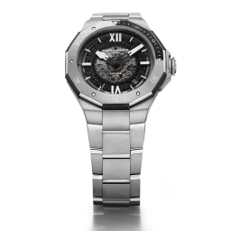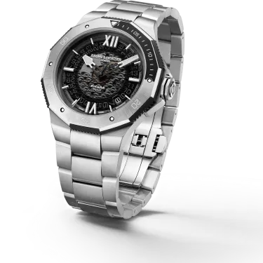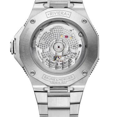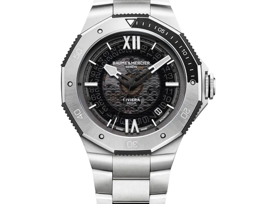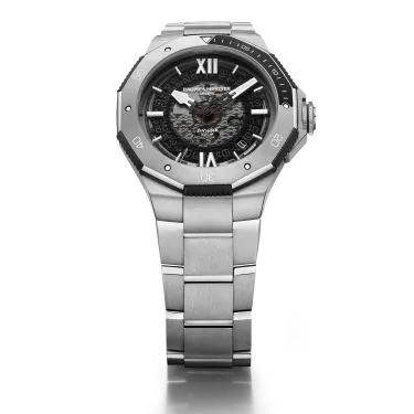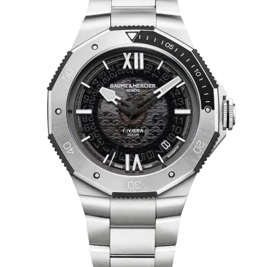 Powered by the prestigious Baumatic calibre movement, the Riviera 10717 is the ultimate Swiss all-terrain watch. Its transparent smoky grey sapphire dial, unidirectional rotating bezel and black anodised aluminium ring emphasise the sporty look of this Swiss-made watch. The ideal watch for water sports.