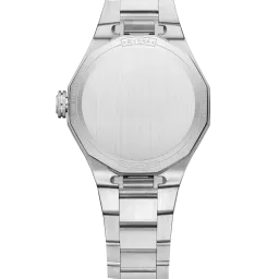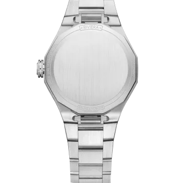 The Riviera 10810 features a warm silver sunray satin dial and a transparent wave pattern with 5N gold-plated riveted Roman numerals and hour markers coated with white Superluminova. The polished and satin-finished stainless steel dodecagonal case features a free-standing octagonal crown with the Phi logo embossed on it. The interchangeable stainless steel bracelet has a reliable system that allows it to be changed without tools.