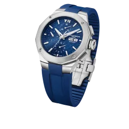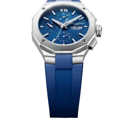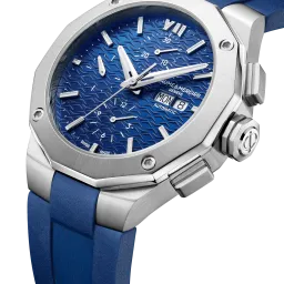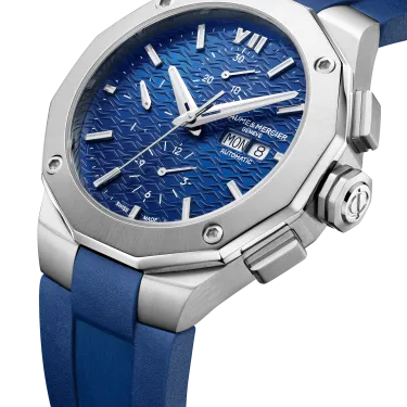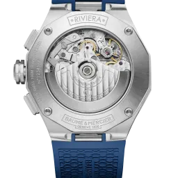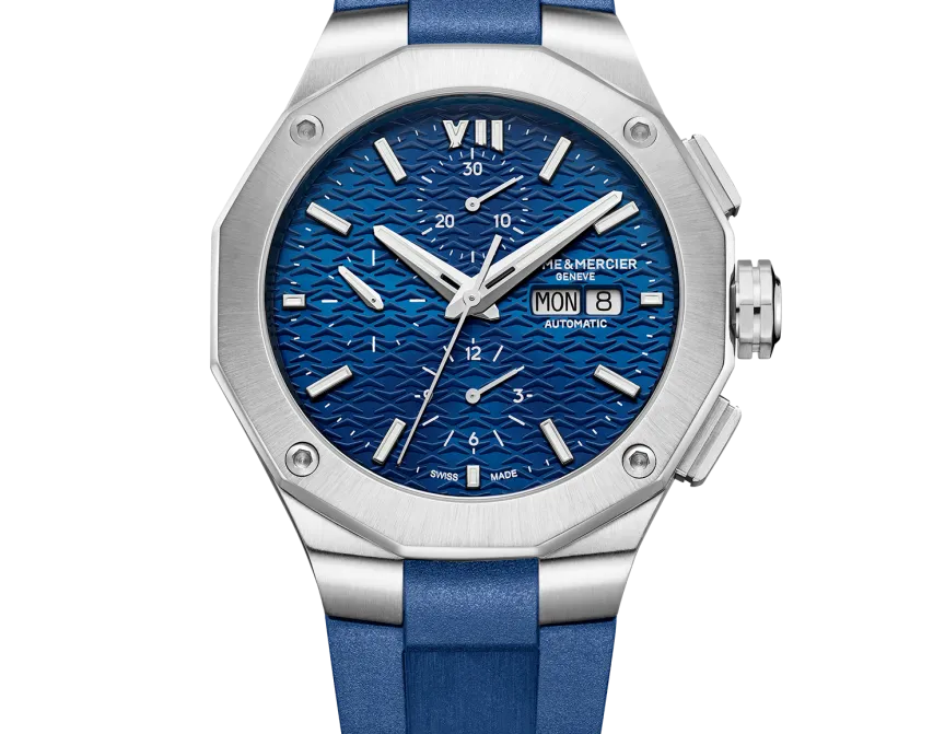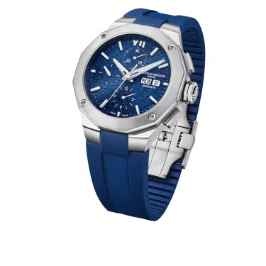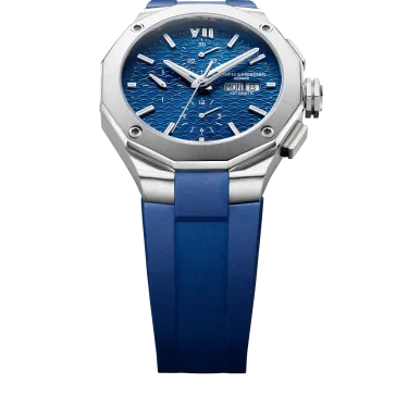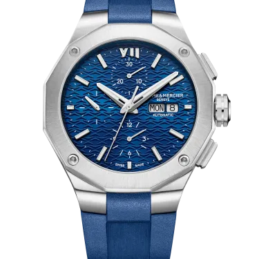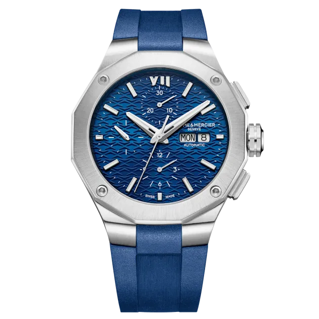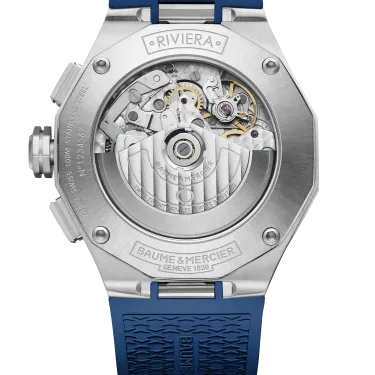 First launched in 1973 and relaunched this year, the Riviera watch revives the spirit of an inspiring era in watchmaking. Robust and reliable, Riviera chronographs feature a proven Swiss-made automatic movement (Valjoux 7750) with a 48-hour power reserve and a frequency of 28,800 vph, or 4 hertz. Each model features a double day-date window at 3 o'clock, a small seconds dial at 9 o'clock, and two auxiliary counters dedicated to chronograph functions: a minute counter at 12 o'clock and an hour counter at 6 o'clock.