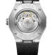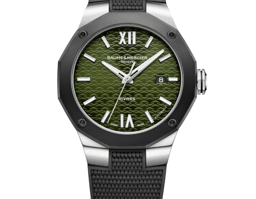 The Riviera features a variation of the Swiss-made automatic movement in subtle dark tones: housing a dark green dial, the 42 mm steel case is mounted on an interchangeable black rubber strap. Attached to the case by four functional screws, the microblasted ADLC steel bezel gives this contemporary timepiece a dynamic look and emphasises its resolutely sporty character. However, the dial elements soften it subtly, notably the sumptuous dark green lacquered colour enhanced by a tone-on-tone wave pattern, as well as white hour markers and Roman numerals.