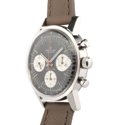 Its 38 mm stainless steel case houses a black dial with three sub-dials dedicated to the chronograph function. It features a red central chronograph hand along with tritium hour markers showing an attractive and well-preserved patina. The case has never been polished and remains in its original condition.