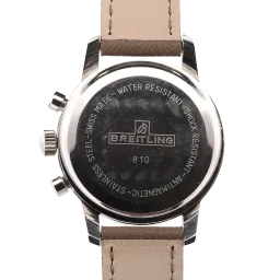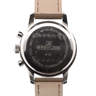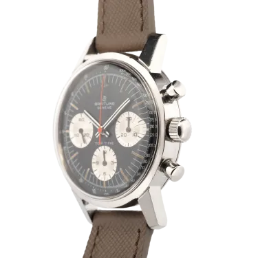 It is equipped with the renowned Venus 175 calibre, a hand-wound chronograph movement with 17 jewels. It beats at 18,000 vibrations per hour and offers a power reserve of approximately 45 hours. This collector’s chronograph comes with a brand-new beige Saffiano leather strap fitted with its Breitling-signed buckle.