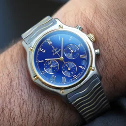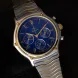 Its 38 mm stainless steel and yellow gold case houses a striking Yves Klein blue dial. The dial features three sub-dials along with a date window positioned at 4:30. The applied Roman numeral hour markers, hands and bezel are crafted in gold. A tachymeter scale is present on the inner flange surrounding the dial.This chronograph is powered by the Zenith El Primero 400 movement.