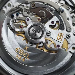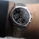 Its stainless steel case, featuring the brand’s signature design, measures 39 mm. It houses a black dial with three sub-dials for the chronograph function and a date window positioned between four and five o’clock. The applied silver Roman numerals, as well as the hands, retain their original tritium.