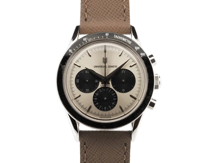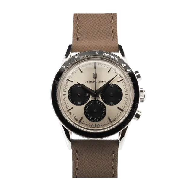 Either bezel can be installed beforehand according to your preference. It is powered by a hand-wound Universal Genève movement, recently serviced by our watchmakers in July 2025.