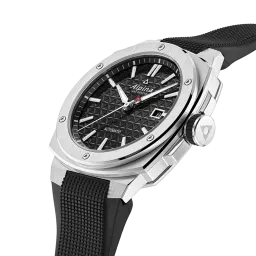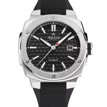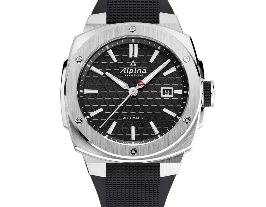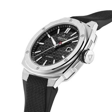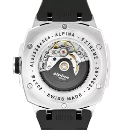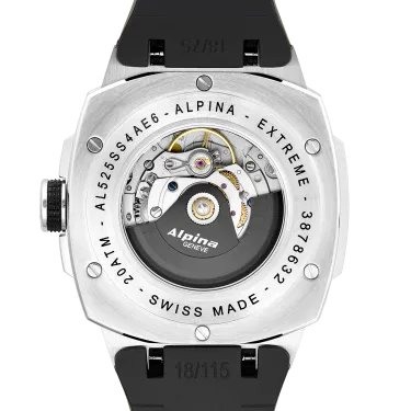 Alpina Alpiner Extreme 41 mm, al-525 caliber, automatic, 38-hour power-reserve, 26 jewels, 28’800 alt/h, brushed and polished stainless steel 3-part case, height of 11,50 mm, scratch-resistant convex sapphire crystal, see-through case-back, water-resistant up to 20 atm/200m/660ft, screw-in crowns and case back, black dial with triangle pattern, black outer ring with white markers, applied silver color indexes filled with white luminous treatment, date window at 3 o’clock, hand-polished silver color hour and minute hands filled with white luminous treatment, polished silver color second hand with red triangle, black rubber strap and with functions hours, minutes, seconds, date.