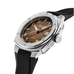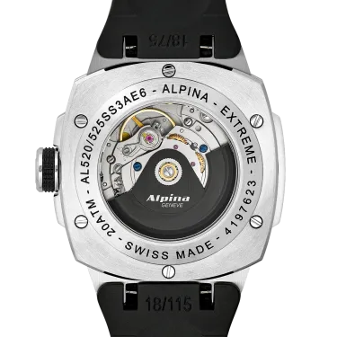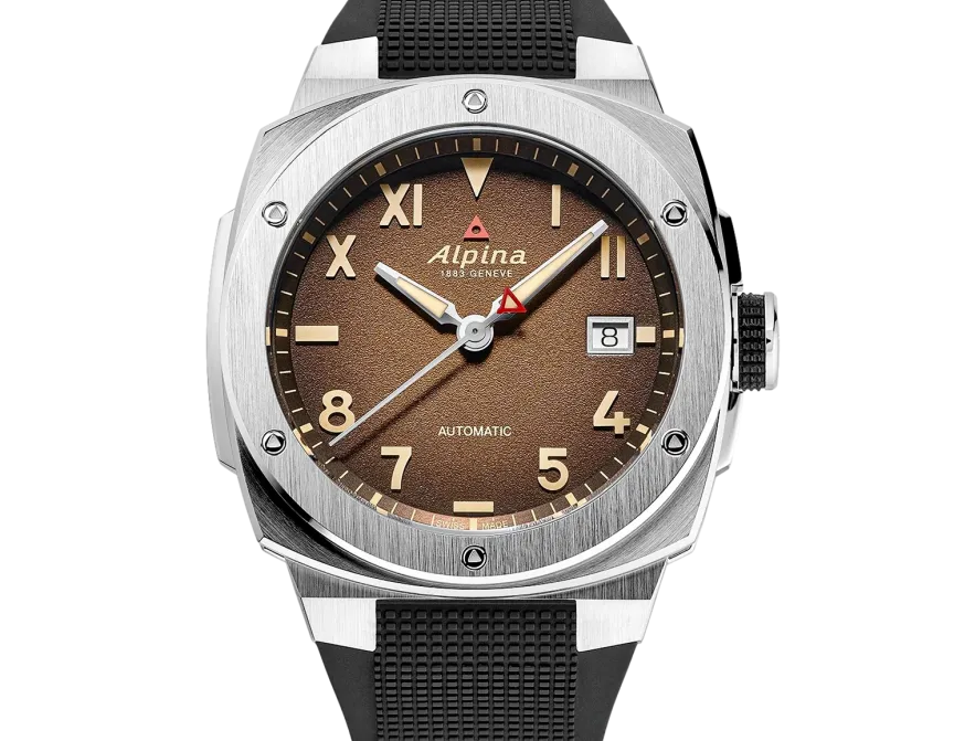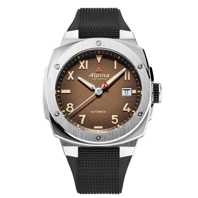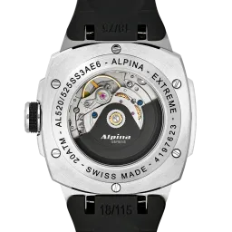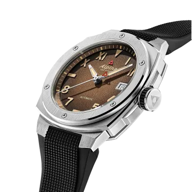 This Alpiner Extreme Automatic California comes in a 39x40.50 mm case with a rubber strap. The automatic movement has a power reserve of 38 hours. The watch displays the hours, minutes, seconds, and date at 3 o'clock.