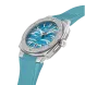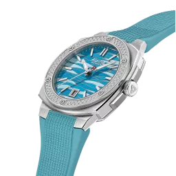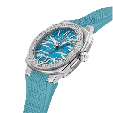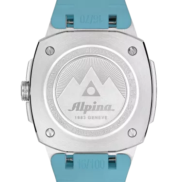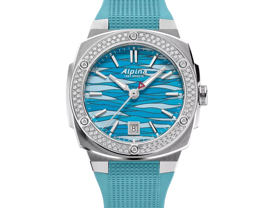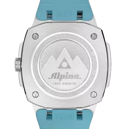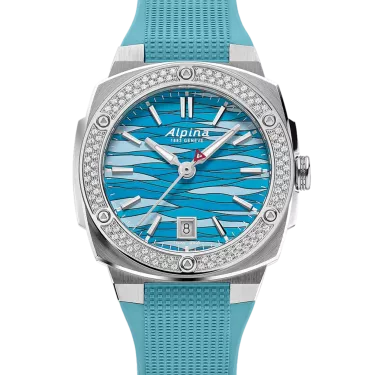 Alpina Alpiner Extreme Quartz 34X35,20 mm, al-220 caliber, Quartz, 1 jewel, brushed and polished stainless steel 3-part case set with 102 diamonds, height of 8,35 mm, Anti-reflective sapphire crystal, Water-resistant up to 10 ATM/100m/330ft, Threaded solid case back with Alpiner pattern engravin, Ice blue dial with glacier pattern, Black markers. Applied silver color indexes filled with white luminous treatment. Date window at 6 o’clock. Hand-polished silver color hour and minute hands filled with white luminous treatment. Polished silver color second hand with red triangle. Ice blue rubber strap. Folding buckle with push button.