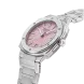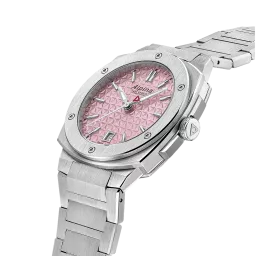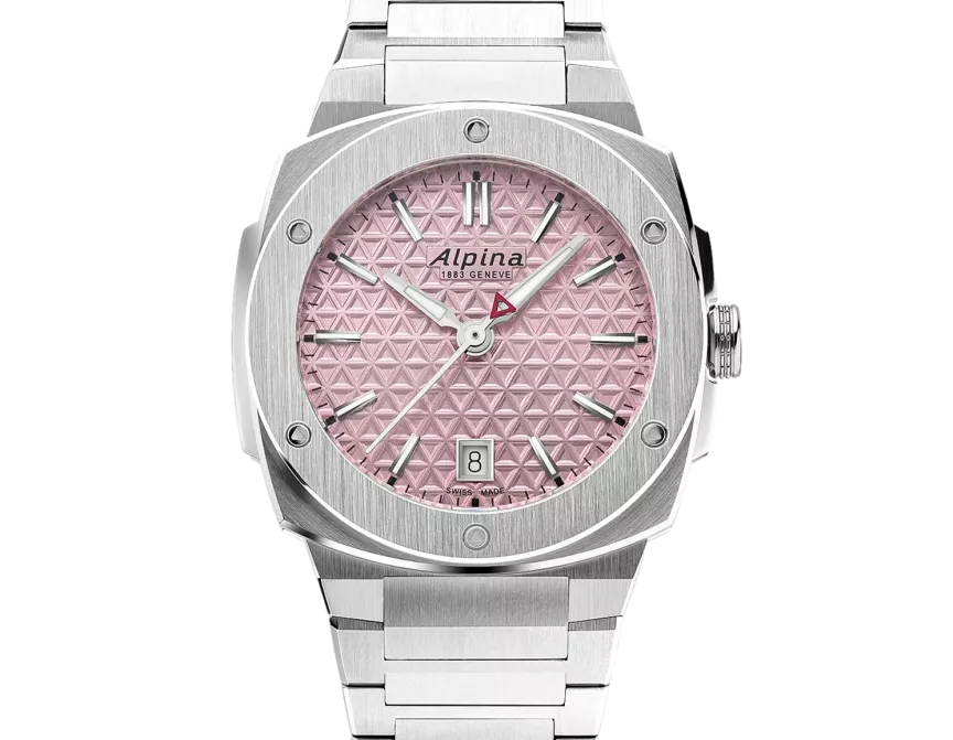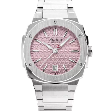 Brushed and polished stainless steel 3-part case, Diameter of 34X35.20 mm, Height of 8,35 mm, Anti-reflective sapphire crystal, Water-resistant up to 10 ATM/100m/330ft, Threaded solid case back with Alpiner pattern engraving. AL-220 caliber, quartz,45 months, 1 jewel. Soap pink dial with triangle pattern, Black markers, Applied silver color indexes filled with white luminous treatment, Date window at 6 o’clock, Hand-polished silver color hour and minute hands filled with white luminous treatment, Polished silver color second hand with red triangle. Brushed and polished stainless steel bracelet