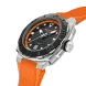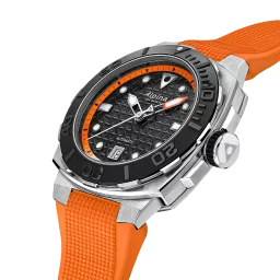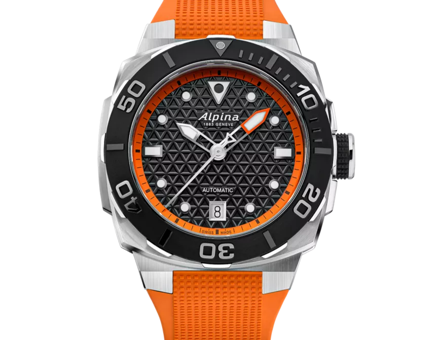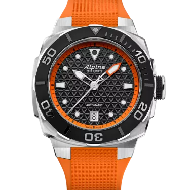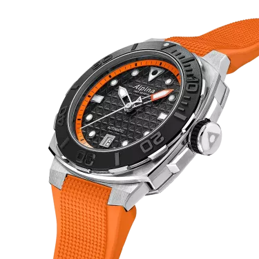 Brushed and polished stainless steel 3-part case, Diameter of 39X40.40 mm, Height of 12,65 mm, Anti-reflective sapphire crystal, Ceramic mat black unidirectional rotating diving bezel, Water-resistant up to 30 ATM/300m/1000ft, Threaded solid case back with Seastrong pattern engraving, Screw-down crown. AL-525 caliber, automatic, 38-hour power-reserve, 28’800 alt/h, 26 jewels. Black dial with triangle pattern, Orange outer ring with black markers, Applied silver color indexes filled with white luminous treatment, Date window at 6 o’clock, Hand-polished silver color hour hand filled with white luminous treatment, Hand-polished silver color and orange minute hand filled with white luminous treatment, Polished silver color second hand with triangle, Orange rubber strap, Folding buckle with push button.