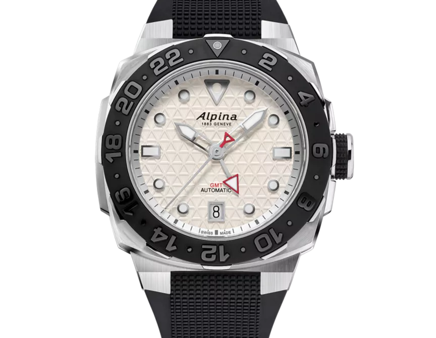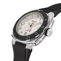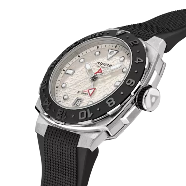 Brushed and polished stainless steel 3-part case, Diameter of 39X40.50 mm, Height of 12,80 mm, Anti-reflective sapphire crystal, Ceramic mat black GMT, bidirectional rotating bezel, Water-resistant up to 30 ATM/300m/1000ft. Threaded solid case back with Seastrong pattern engraving, Screw-down crown. AL-560 caliber, automatic, 50-hour power-reserve, 28’800 alt/h, 25 jewels. Silver color dial with triangle pattern, Silver color outer ring with black markers, Applied silver color indexes filled with white luminous treatment, Date window at 6 o’clock, Hand-polished silver color hour and minute hands filled with white luminous treatment