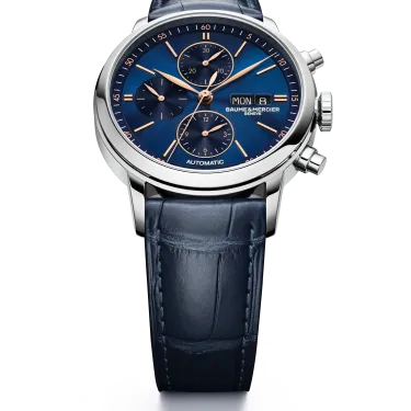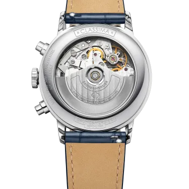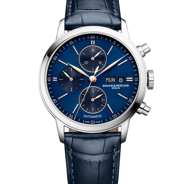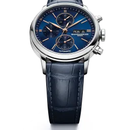 The Classima M0A10784 watch embodies sophistication through the finesse of its decorative elements. Its satin-finished blue lacquered dial, dark blue counters and delicate gold details combine to create an elegant ensemble. The refined leaf-shaped hands and gold hour markers add a touch of luxury, while the date and day windows at 3 o'clock provide practical functionality. Housed in a 42 mm polished stainless steel case with a scratch-resistant sapphire crystal and sapphire caseback, the watch is built to last. Its automatic movement operates at a frequency of 4 Hz and has a power reserve of 48 hours, ensuring reliability and performance. Water-resistant to 5 ATM, this timepiece can be worn every day. Mounted on an interchangeable blue alligator strap with a stainless steel buckle, it guarantees comfort and security.