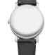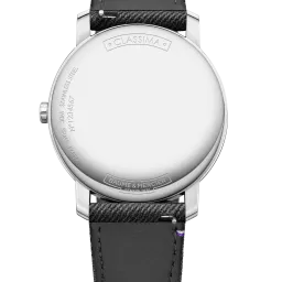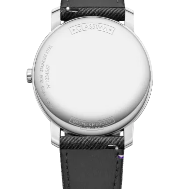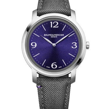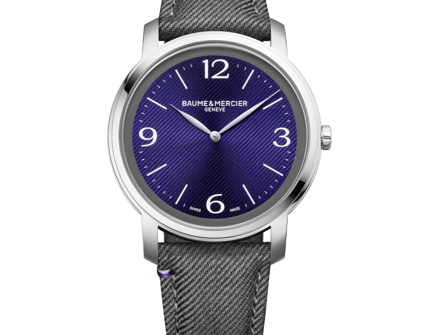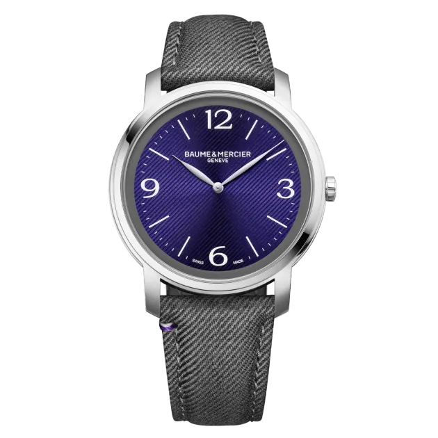 Housed in a 42 mm diameter case with a quartz movement, the M0A10706 model features a sunray satin-finished purple dial with a grey flange and diagonal line decoration, white Arabic numerals and hour markers, and rhodium-plated leaf hands. Its straps are made of light grey fabric (Super 120) with saddle stitching and black alligator leather.