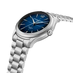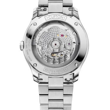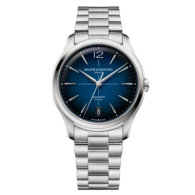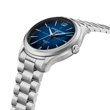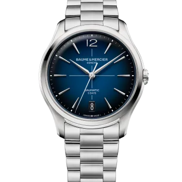 The Clifton 10792 features a round polished-satin-finished steel case and joins the collection in a 39 mm format. Its case is fitted with a stainless steel crown and an open sapphire crystal case back. The blue lacquered gradient dial, edged with a white minute track and white index, highlights the Arabic numeral at 12 o'clock, the faceted rhodium-plated trapezoidal hour markers and the alpha-shaped hands. It is equipped with a Baumatic automatic movement (BM13-1975A) with a 5-day power reserve and 5 ATM water resistance. The integrated 3-row interchangeable stainless steel bracelet features a reliable system that allows it to be changed without tools.