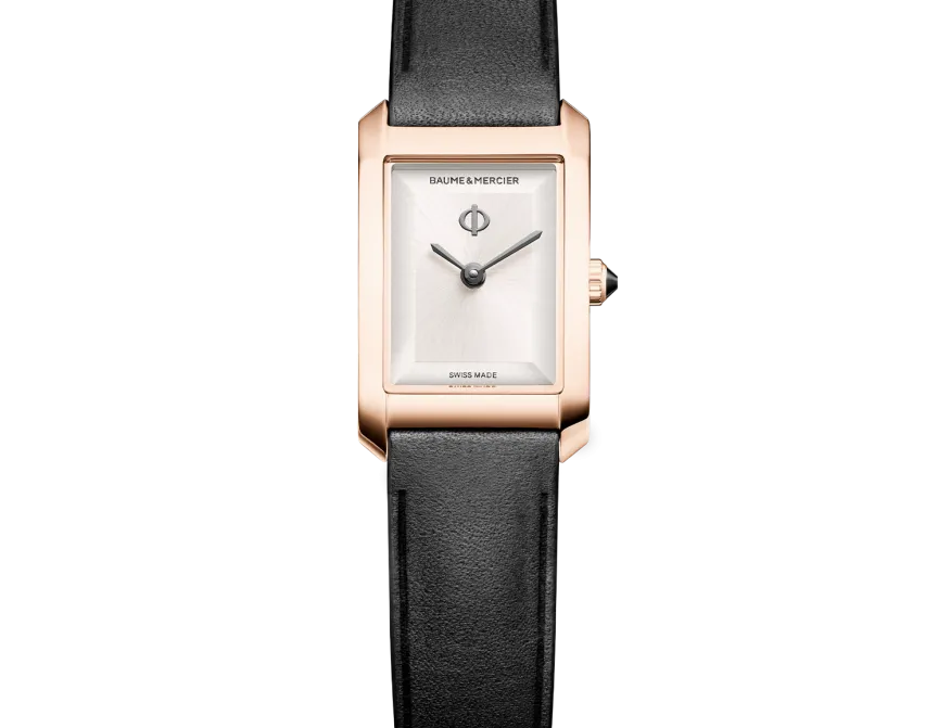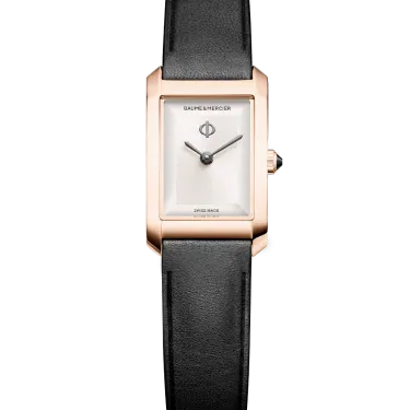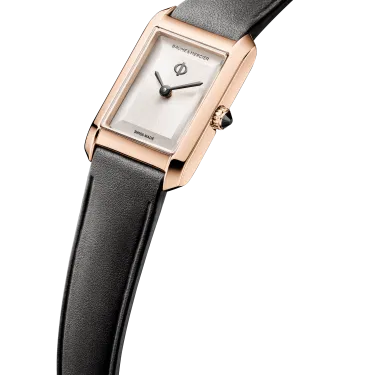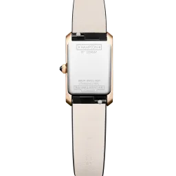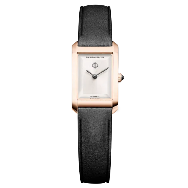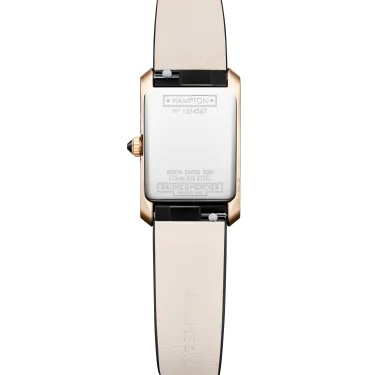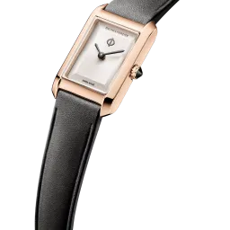The Hampton 10861 stands out with its rectangular case in 4N PVD-coated polished steel and joins the collection in a mini format. Its crown, set with a black agate, and its solid case back in 4N PVD-coated polished steel discreetly complete the design. Its warm silver sunburst satin-finished dial with relief highlights the Phi logo and the rhodium-plated sword-shaped hands. Powered by a quartz movement (Ronda 751), it offers a 5-year power reserve and is water-resistant to 5 ATM. Its interchangeable black calfskin strap features a reliable system allowing it to be changed without tools.
