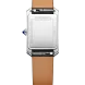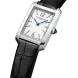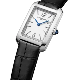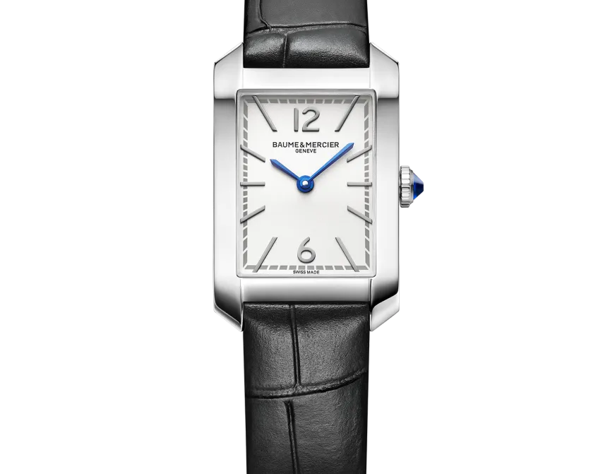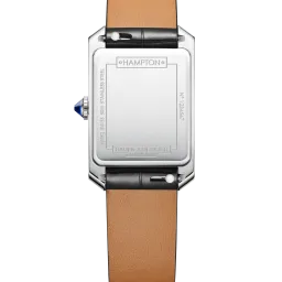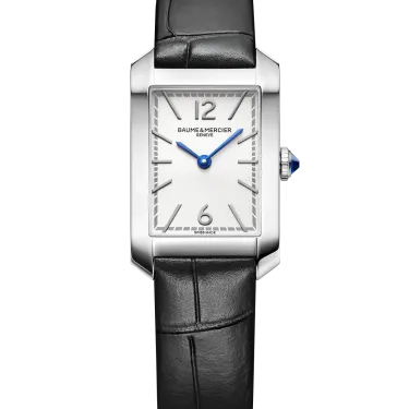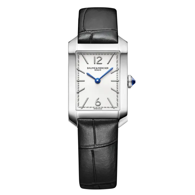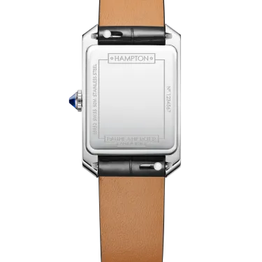 The Hampton 10795 features a silvered white opaline dial with rhodium-plated Arabic numerals and riveted hour markers, as well as blue sword-shaped hands. The rectangular polished stainless steel case features a cabochon-shaped steel crown set with a synthetic blue spinel. The interchangeable black leather strap with alligator pattern features a reliable system that allows for tool-free replacement.