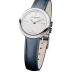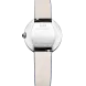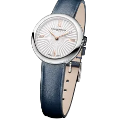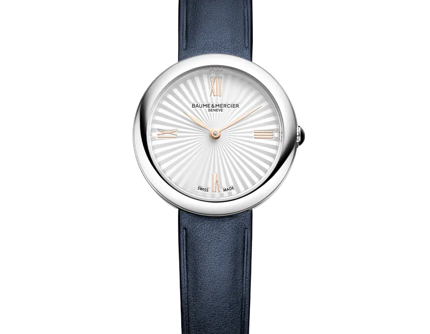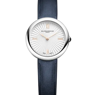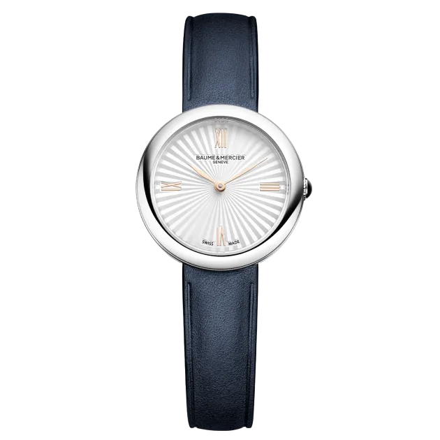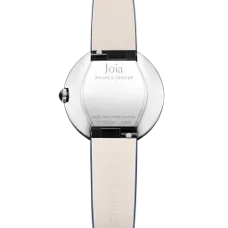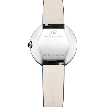 The Baume & Mercier 10847 Joia stands out with its round polished steel case and joins the collection in a 28 mm size. Its crown, set with a black agate, and its solid polished steel case back discreetly complete the design. Its silver sunburst dial highlights the Roman numerals, as well as the 4N gold leaf-shaped hands. Powered by a quartz movement (Ronda 751), it offers a 5-year power reserve and is water-resistant to 5 ATM. Its interchangeable midnight blue calfskin strap features a reliable system that allows it to be changed without tools.