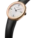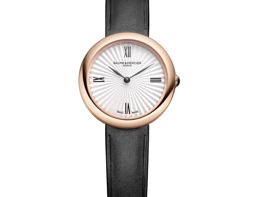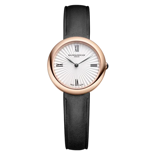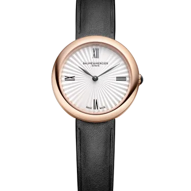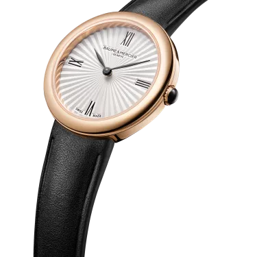 The Baume & Mercier 10849 Joia stands out with its round case in polished 4N PVD-coated steel and joins the collection in a 28 mm size. Its crown, set with a black agate, and its solid case back in polished 4N PVD-coated steel discreetly complete the design. Its silver sunburst dial highlights the Roman numerals, as well as the black decal leaf-shaped hands. Powered by a quartz movement (Ronda 751), it offers a 5-year power reserve and is water-resistant to 5 ATM. Its interchangeable black calfskin strap features a reliable system that allows it to be changed without tools.