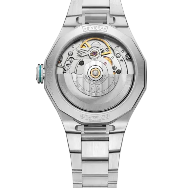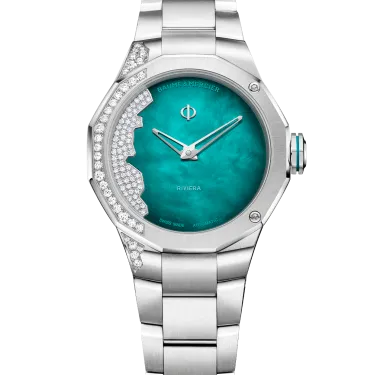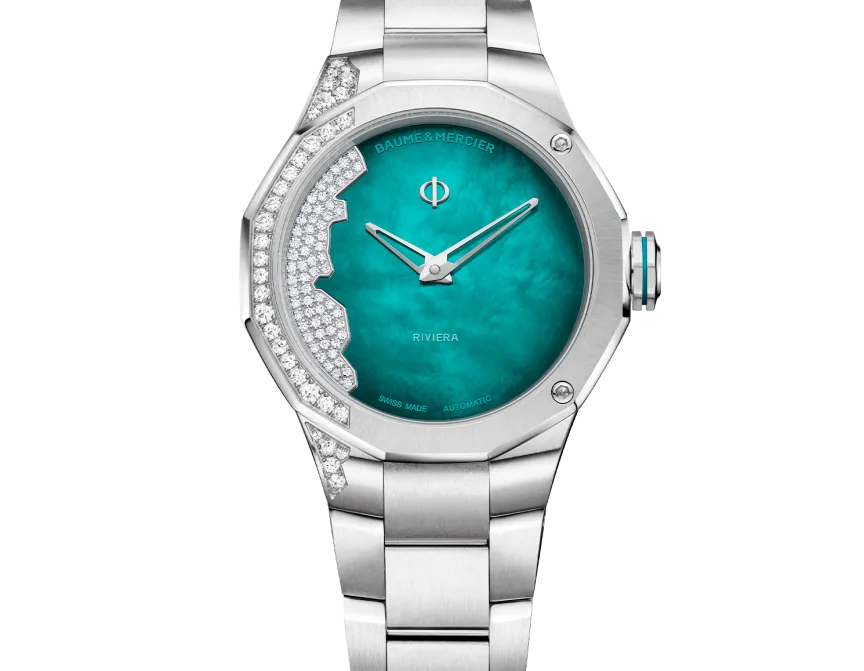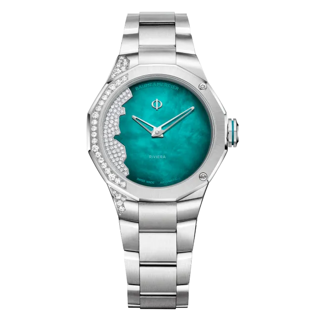 In 2026, the Riviera women’s collection is expanded with a new interpretation of the iconic ‘Coastline’ model, a 33 mm automatic watch. In its stainless steel case, this Riviera, with its character as assertive as ever, reveals a design of rare uniqueness with its green gradient dial, enhanced by delicate mother-of-pearl that subtly catches the light. Set with 63 diamonds, its dial traces the coastline of the French Riviera and invites you on a luminous getaway between Monaco and Saint-Tropez. Like a summer wave, this exclusive setting flows harmoniously across the bezel and case. Bold, it appears where you least expect it. That is the Riviera spirit.