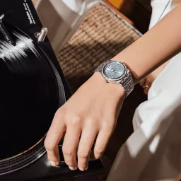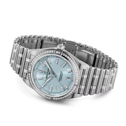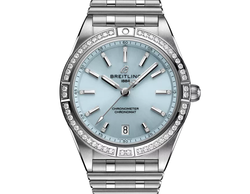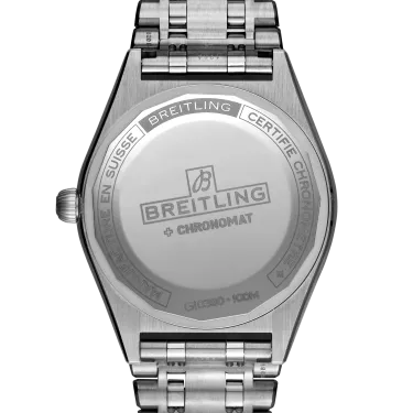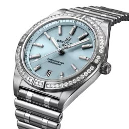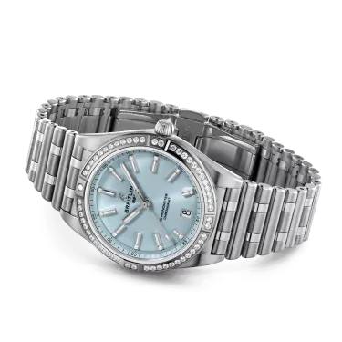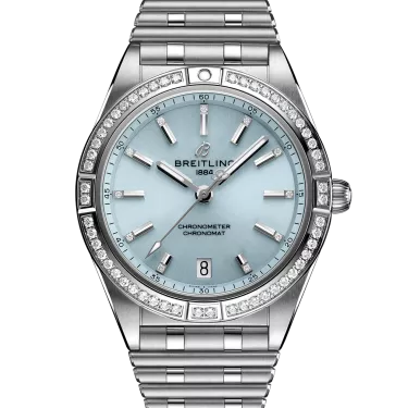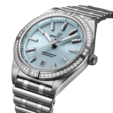 Stylish yet elegant, the modern-retro inspired Chronomat Automatic 36 is the versatile sporty and chic watch for any occasion. It is available in an array of metal cases, from cool stainless steel, to goes-with-everything bicolor, or even luxurious 18k red gold. Women craving extra sparkle will also be able to opt for diamond-set bezels, indices, and colorful dials. This specific Chronomat Automatic 36 features a stainless steel case with an 18k grey gold gem-set bezel matched to an Ice Blue dial. This Chronomat is powered by the Breitling Caliber 10, a COSC-certified chronometer.
