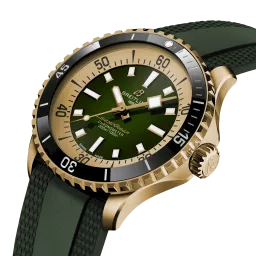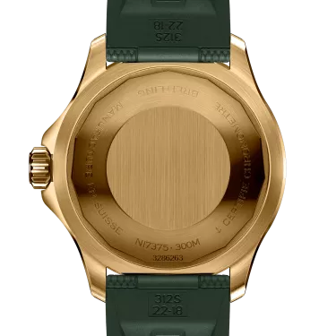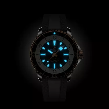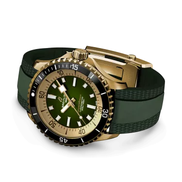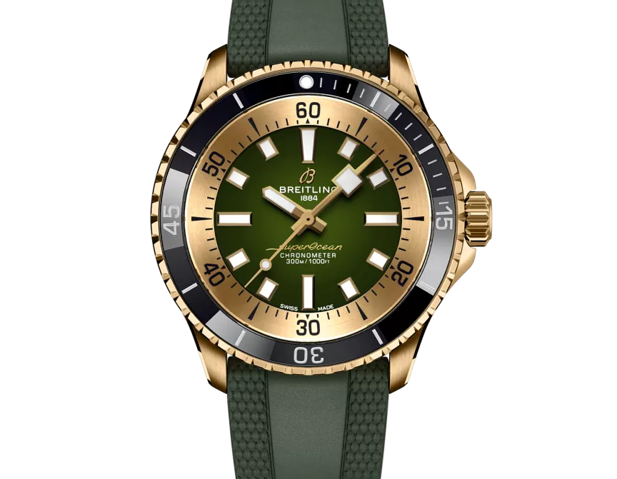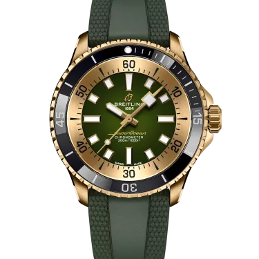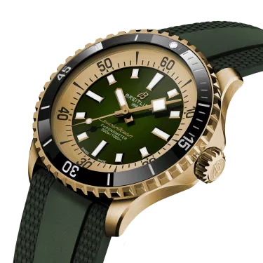Performance and style for all your water-based pursuits. In the 1960s, the new sport of scuba diving was all the rage. For divers, timing was everything, and Breitling set out to give them the most clear-cut dive watch possible by eliminating any feature that didn’t support their lifesaving needs underwater. This pared-down watch was named the Slow Motion. What remained were clean lines, chunky luminescent indexes, squared-off hands and a high-contrast dial ring, all aimed at maximum legibility. Practical, yes. But what people really fell in love with was the look. The new Superocean retraces the Slow Motion's celebrated design codes, while adding modern features, like a ceramic-inlayed bezel and brightly colored dials. Broad hands and indexes in luminescent Super-LumiNova® allow for easy readability underwater. The watch is water resistant to 300 m (1000 ft), as well as being shock-, sand- and saltwater-resistant. The bronze version uses a special alloy that has excellent resistance to corrosion, yet will still develop a subtle patina over time that makes the watch even more unique. The two strap options (rubber and metal bracelet) have a folding clasp that allows for micro-adjustments of up to 15 mm for easy wear over rashies and wetsuits. Its scratch-proof ceramic inlayed bezel will never wear or fade. For safety, the bezel is uni-directional on most sizes and bi-directional with a patented lock on the 46 mm. Best of all, this is no longer strictly a dive watch—surf with it, swim with it, hit the beach bar with it, then wear it out to dinner. The Superocean perfectly balances the nostalgia of its heritage with a fresh new look.