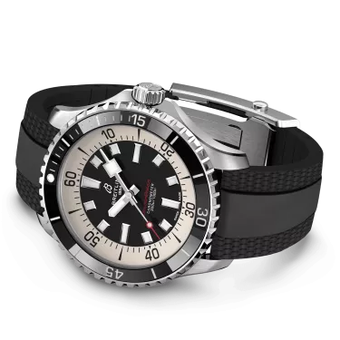 The watch is water resistant to 300 m (1000 ft), as well as being shock-, sand- and saltwater-resistant. The bronze version uses a special alloy that has excellent resistance to corrosion, yet will still develop a subtle patina over time that makes the watch even more unique. The two strap options (rubber and metal bracelet) have a folding clasp that allows for micro-adjustments of up to 15 mm for easy wear over rashies and wetsuits. Its scratch-proof ceramic inlayed bezel will never wear or fade. For safety, the bezel is uni-directional on most sizes and bi-directional with a patented lock on the 46 mm. Best of all, this is no longer strictly a dive watch—surf with it, swim with it, hit the beach bar with it, then wear it out to dinner. The Superocean perfectly balances the nostalgia of its heritage with a fresh new look.