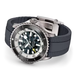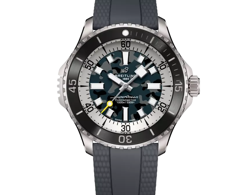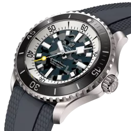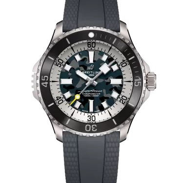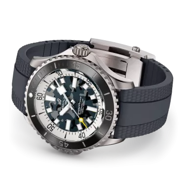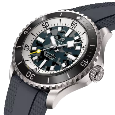 Super performance for all your water-based pursuits. In the 1960s, the new sport of scuba diving was all the rage. For divers, timing was everything, and Breitling set out to give them the most clear-cut dive watch possible by eliminating any feature that didn’t support their lifesaving needs underwater. This pared-down watch was named the Superocean Slow Motion. What remained were clean lines, chunky luminescent indexes, squared-off hands and a high-contrast dial ring, all aimed at maximum legibility. Practical, yes. But what people really fell in love with was the look. The Superocean Automatic 46 Super Diver retraces the Slow Motion's celebrated design codes, while adding modern features, like a scratch-proof matt ceramic-inlayed bezel and camouflage dials. Broad hands and indexes in luminescent Super-LumiNova® allow for easy readability underwater. The watch is water resistant to 1,000 m (3,300 ft), as well as being shock-, sand- and saltwater-resistant. And there’s much more to this watch than meets the eye: Its soft-iron inner case offers protection against the effects of magnetic fields, while its bi-directional rotating bezel can be safely secured with a lock on the left side of the case. The two strap options (rubber or titanium bracelet) have a folding clasp that allows for micro-adjustments of up to 15 mm for easy wear over rashies and wetsuits. Best of all, this is no longer strictly a dive watch—surf with it, swim with it, hit the beach bar with it, then wear it out to dinner. The Superocean perfectly balances the nostalgia of its heritage with a fresh new look.