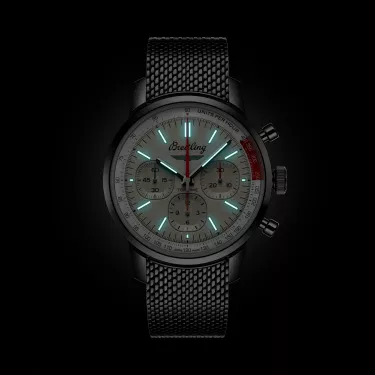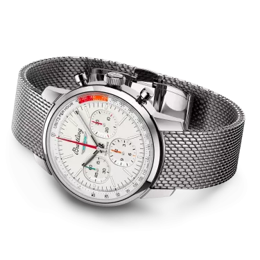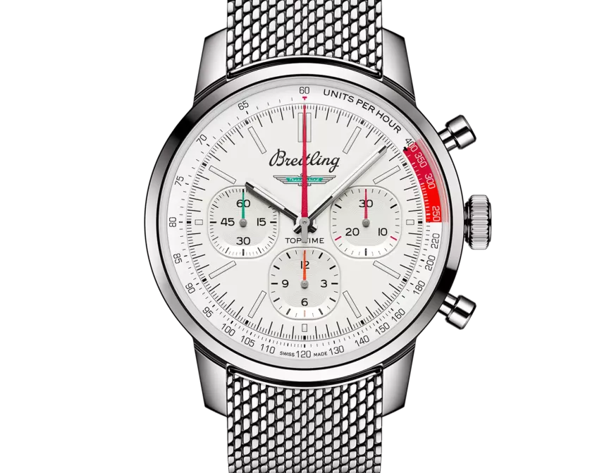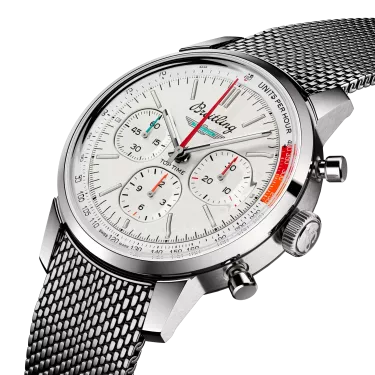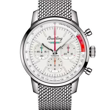 The 1960s was a decade of experimentation, fun, freedom and energy. Whether cruising on a motorcycle or revving up a sportscar, living life at full speed was the order of the day. Willy Breitling felt this change of pace and set out to design an unconventional chronograph that would capture the verve of era. He called it the Top Time. That spirited tradition continues today with Breitling partnering with some of the coolest names in wheels to create its Top Time designs. The Ford Thunderbird was first unveiled at the 1954 Detroit auto show. It was touted as a fun-to-drive cabriolet that made its presence felt with its luxurious design, solid build and dramatic tailfin. The Top Time B01 Ford Thunderbird features the colors and emblem of its classic-car counterpart as well as a perforated leather racing strap, speed-measuring tachymeter scale and contrasting “squircle” (not quite square, not quite round) subdials that give the feel of vintage dashboard gauges. It also comes with a brag-worthy engine under the hood: the exceptional Breitling Manufacture Caliber 01.