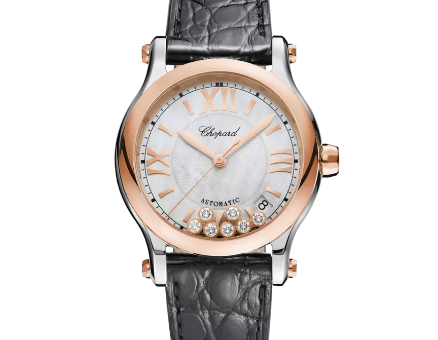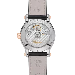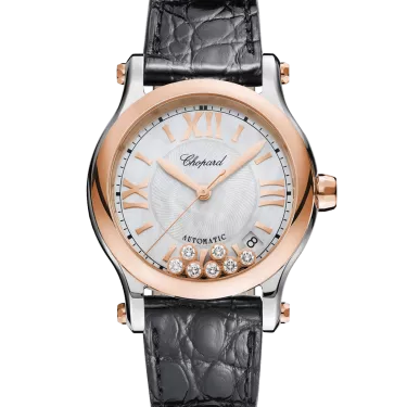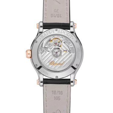 This Happy Sport 36 mm automatic watch sparkles with femininity. Stunningly crafted from 18k rose gold and stainless steel with a polished bezel and black strap, its stylish aesthetic is perfectly Chopard. The mother-of-peal dial provides a precious backdrop for the rose gold-tone Roman numerals and hands, while seven of Chopard's signature moving diamonds playfully dance in an exuberant display of light.