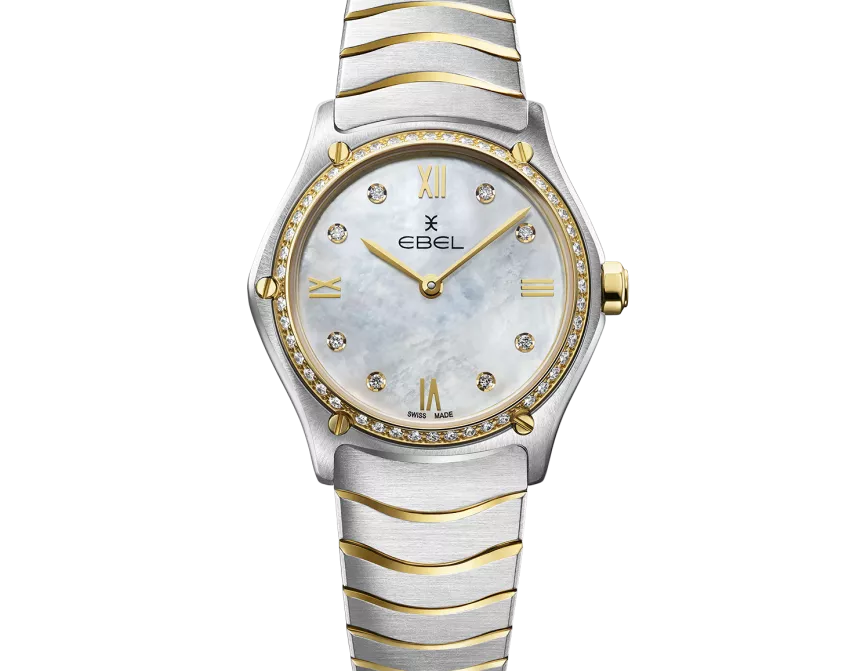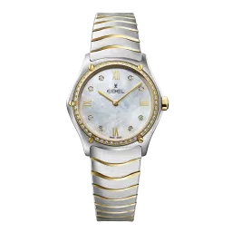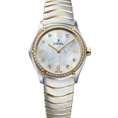 Women's EBEL Sport Classic watch, stainless steel and 18K yellow gold case with 47 diamonds (0.3055 ct), Ø 29.0mm, white mother-of-pearl dial with applied Roman numerals and 8 diamonds (0.052 ct), sapphire crystal with antireflective treatment underneath, two-tone stainless steel wave link bracelet with a deploying buckle, Swiss quartz movement, water-resistant up to 50 Meter.