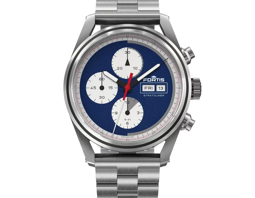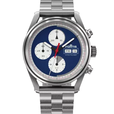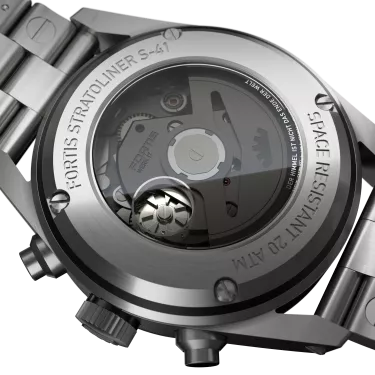Adding to many firsts in the history of Fortis, the redefined Stratoliner Collection features the fi rst manufacture calibre which was custom built for space and tested in the Stratosphere. Inspired by the persistence of great visionaries, the New Stratoliner is both tribute and motivation – it is the tool for those inventing tomorrow. It is the tool to go beyond the impossible. Tested and proven in the Stratosphere As a direct result of the rich history and the enthusiasm for all things space related, Fortis have founded a new partnership with the Swedish Space Corporation. In a thoroughly researched and meticulously planned testing phase, the new manufacture calibre WERK 17 was tested and approved under the harsh conditions of the stratosphere. A robust and reliable column wheel chronograph The new Fortis manufacture calibre, the WERK 17, is a self-winding chronograph calibre which features a column wheel for enhanced reliability. The custom designed traversing bridge offers ultimate, space-proof robustness. It has been regulated to the Fortis performance requirements resulting in the highest accuracy for every environment. Furthermore, the new Stratoliner boasts a power reserve of 60hrs. The Stratoliner Collection consists of three stainless steel versions with a 41mm case diameter: White Dust, Cool Gray and Cosmic Gray. Inspired by the depth and vastness of space, the Dust DialTM of the new Stratoliner combines functionality with design. Details in Superluminova® X1 and the double sided SpaceAR Coating on the sapphire ensure highest readability even in the harsh conditions of the Stratosphere and the outer space. The Stratoliner collection is available on Block Bracelet with Slide Clasp or on Aviator Strap. The caseback impresses with smoked sapphire featuring the Fortis spaceship window, granting a glimpse to the column wheel. The engraved quote “Der Himmel ist nicht das Ende der Welt“ is a gentle reminder: Sky is no limit.