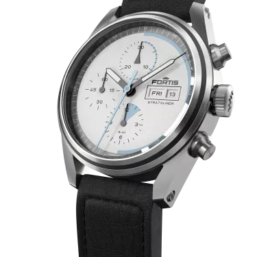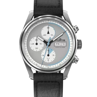 Adding to many firsts in the history of Fortis, the redefined Stratoliner Collection features the fi rst manufacture calibre which was custom built for space and tested in the Stratosphere. Inspired by the persistence of great visionaries, the New Stratoliner is both tribute and motivation – it is the tool for those inventing tomorrow. It is the tool to go beyond the impossible. Tested and proven in the Stratosphere As a direct result of the rich history and the enthusiasm for all things space related, Fortis have founded a new partnership with the Swedish Space Corporation. In a thoroughly researched and meticulously planned testing phase, the new manufacture calibre WERK 17 was tested and approved under the harsh conditions of the stratosphere. A robust and reliable column wheel chronograph The new Fortis manufacture calibre, the WERK 17, is a self-winding chronograph calibre which features a column wheel for enhanced reliability. The custom designed traversing bridge offers ultimate, space-proof robustness. It has been regulated to the Fortis performance requirements resulting in the highest accuracy for every environment. Furthermore, the new Stratoliner boasts a power reserve of 60hrs. The Stratoliner Collection consists of three stainless steel versions with a 41mm case diameter: White Dust, Cool Gray and Cosmic Gray. Inspired by the depth and vastness of space, the Dust DialTM of the new Stratoliner combines functionality with design. Details in Superluminova® X1 and the double sided SpaceAR Coating on the sapphire ensure highest readability even in the harsh conditions of the Stratosphere and the outer space. The Stratoliner collection is available on Block Bracelet with Slide Clasp or on Aviator Strap. The caseback impresses with smoked sapphire featuring the Fortis spaceship window, granting a glimpse to the column wheel. The engraved quote “Der Himmel ist nicht das Ende der Welt“ is a gentle reminder: Sky is no limit.