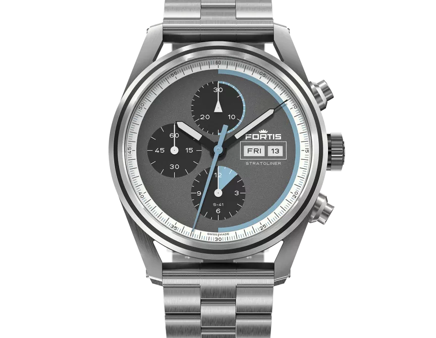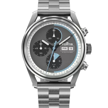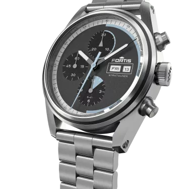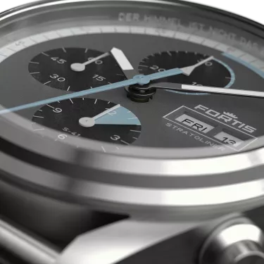 Adding to many firsts in the history of Fortis, the redefined Stratoliner Collection features the fi rst manufacture calibre which was custom built for space and tested in the Stratosphere. Inspired by the persistence of great visionaries, the New Stratoliner is both tribute and motivation – it is the tool for those inventing tomorrow. It is the tool to go beyond the impossible. Tested and proven in the Stratosphere As a direct result of the rich history and the enthusiasm for all things space related, Fortis have founded a new partnership with the Swedish Space Corporation. In a thoroughly researched and meticulously planned testing phase, the new manufacture calibre WERK 17 was tested and approved under the harsh conditions of the stratosphere. A robust and reliable column wheel chronograph The new Fortis manufacture calibre, the WERK 17, is a self-winding chronograph calibre which features a column wheel for enhanced reliability. The custom designed traversing bridge offers ultimate, space-proof robustness. It has been regulated to the Fortis performance requirements resulting in the highest accuracy for every environment. Furthermore, the new Stratoliner boasts a power reserve of 60hrs. The Stratoliner Collection consists of three stainless steel versions with a 41mm case diameter: White Dust, Cool Gray and Cosmic Gray. Inspired by the depth and vastness of space, the Dust DialTM of the new Stratoliner combines functionality with design. Details in Superluminova® X1 and the double sided SpaceAR Coating on the sapphire ensure highest readability even in the harsh conditions of the Stratosphere and the outer space. The Stratoliner collection is available on Block Bracelet with Slide Clasp or on Aviator Strap. The caseback impresses with smoked sapphire featuring the Fortis spaceship window, granting a glimpse to the column wheel. The engraved quote “Der Himmel ist nicht das Ende der Welt“ is a gentle reminder: Sky is no limit.