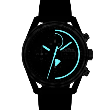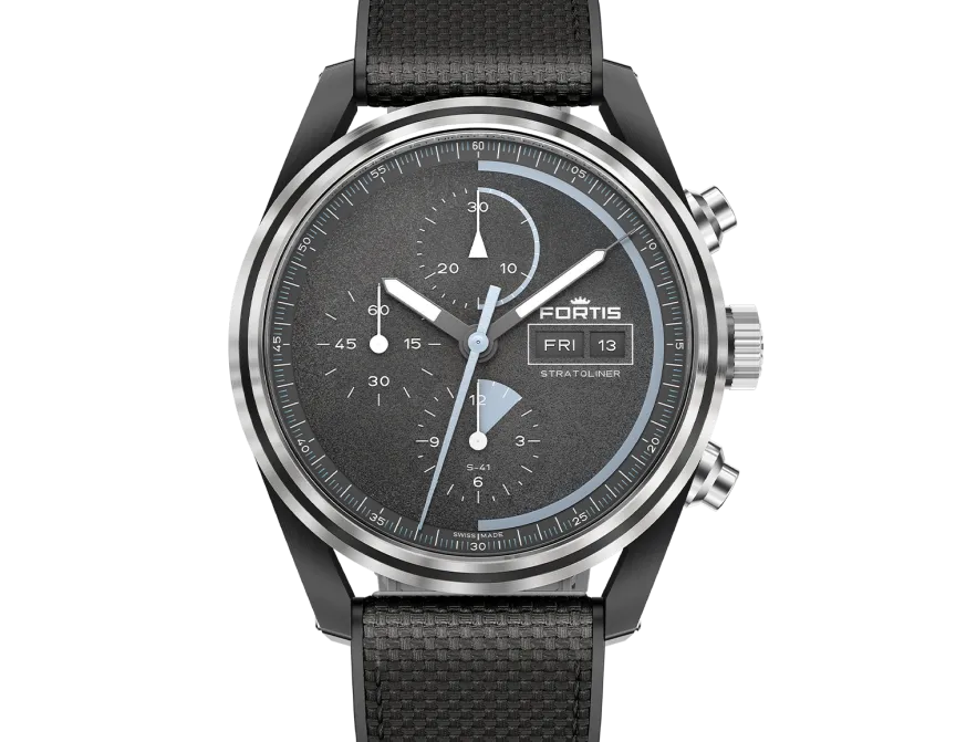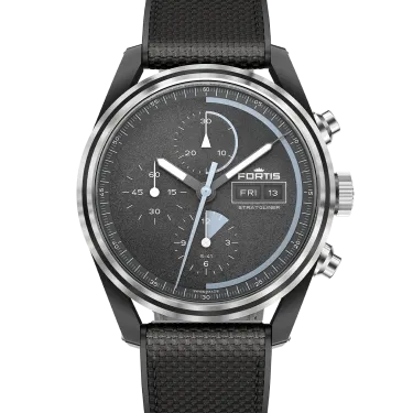 With the Stratoliner Gravity Black, Fortis introduces the first-ever DLC-coated case in the Stratoliner series – a new benchmark in toughness, legibility and design clarity. Crafted for those who move ahead of their time, with the same clarity and purpose that defines their path. Every detail engineered to withstand extremes – and remain unwavering when it matters most. The case is milled from recycled stainless steel and surface-treated in matte graphite black DLC. This specialised coating reaches a surface hardness of up to 4500 Vickers – nearly 20 times that of standard stainless steel – setting a new benchmark for resilience. Paired with a smoked sapphire caseback, antireflective coatings and the sleek Orbit Bezel the design is focused entirely on performance, stealth and mission-readiness. At the heart of the Gravity Black ticks Werk 17 – the Fortis column wheel chronograph developed in collaboration with the Swedish Space Corporation. Tested during high-altitude launches, re-entries and impact landings, the calibre has proven itself in harsh space conditions. With a 60-hour power reserve, day-date function and COSC-level precision, Werk 17 is built to deliver under extreme conditions. The stardust-textured dial features unique space-travel markers. Black metallic hands with Superluminova® X1 ensure legibility in any environment – from cockpit to stratosphere. The integrated performance strap – a blend of FKM rubber and high-resistance textile – offers both comfort and resilience. Secured with a DLC-coated pin buckle, it’s engineered for reliability through movement, friction and pressure.