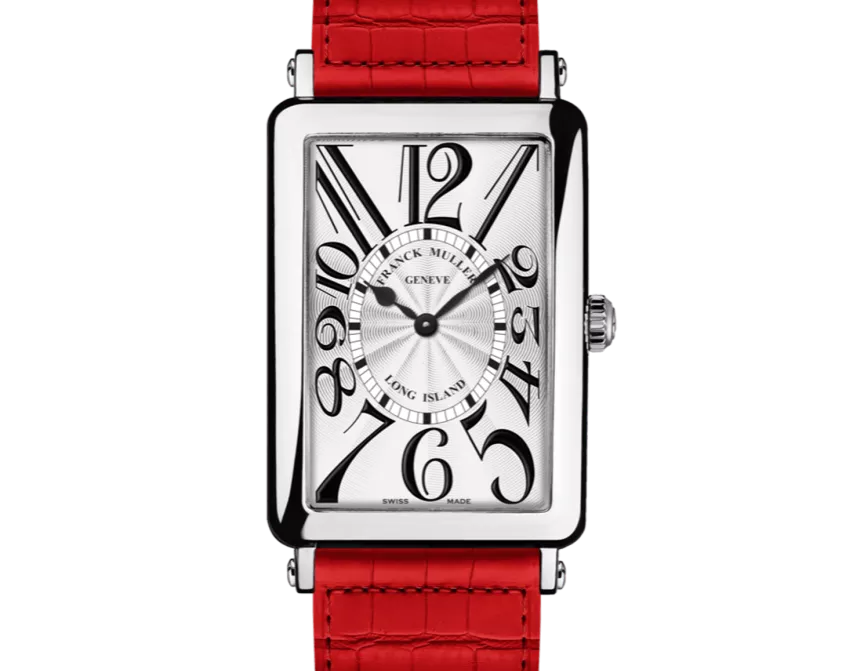 The architecture of the Long Island™ pays tribute to the Art Deco movement in a new vision of the Novecento style. The Long Island, driven by its rectangular shape and numbers has become a leading collection of Franck Muller. Available in various sizes and complications, the Long Island is designed to perfectly fit the wrist of its owner. Long Island 18k white gold & hand polished case, Width: 26 mm x Length: 44.55 mm x Thickness: 7.05 mm, Sapphire crystal, Water resistant up to 30 meters, Stamped guilloché with sun pattern dial, 20 layers of translucent lacquer, MVT FM 2750-QZ movement, Quartz movement, Battery life of 3 years, 5 rubies, Diameter: Ø 17.50 mm. Thickness 2.75 mm, Quartz frequency at 32’768 Hz, Côtes de Genève and sunray brushing on the casing ring, Hand sewn alligator strap with 18k white gold & hand polished buckle and with functions hours, minutes.
