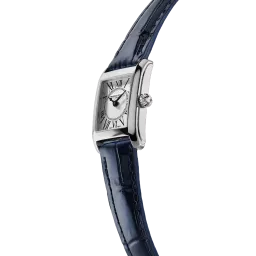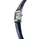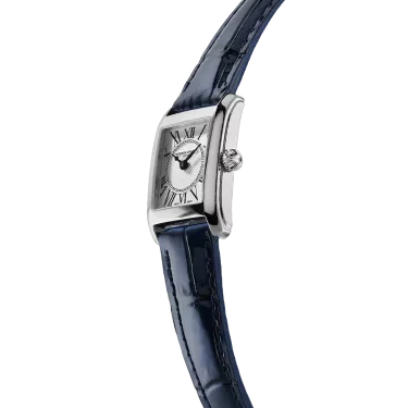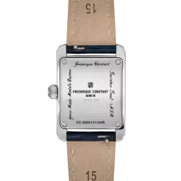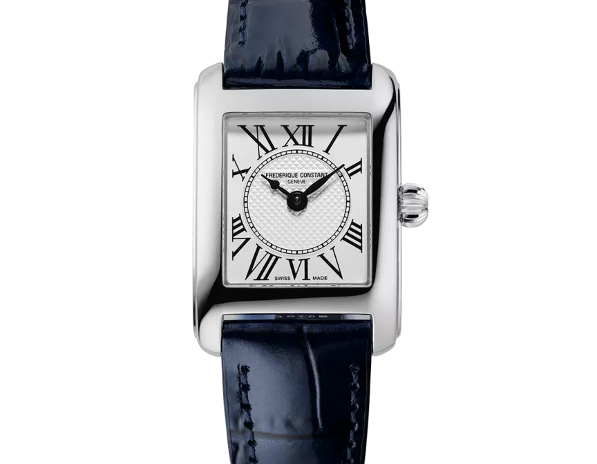 Frederique Constant Classics Carrée 23x21 mm, FC-200 caliber, quartz movement. 4 jewels, 75 months battery life; Polished stainless steel 2-parts case. Diameter of 23x21mm. Convex sapphire crystal. Water-resistant to 3 ATM; Silver-colored dial, guilloché decoration, printed Roman numerals. Hand-polished black hands & Blue shiny Calf leather strap.