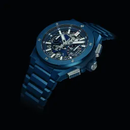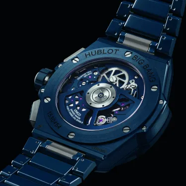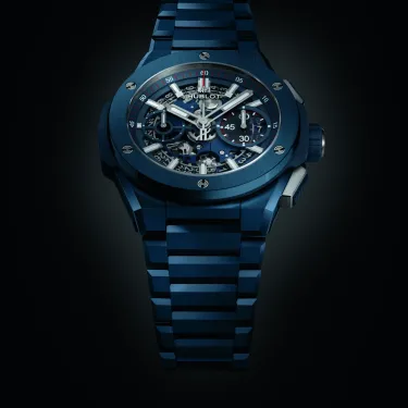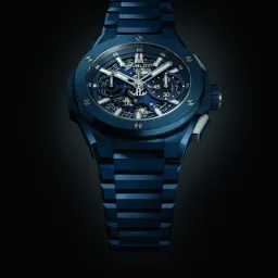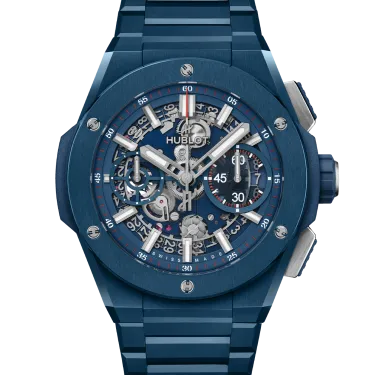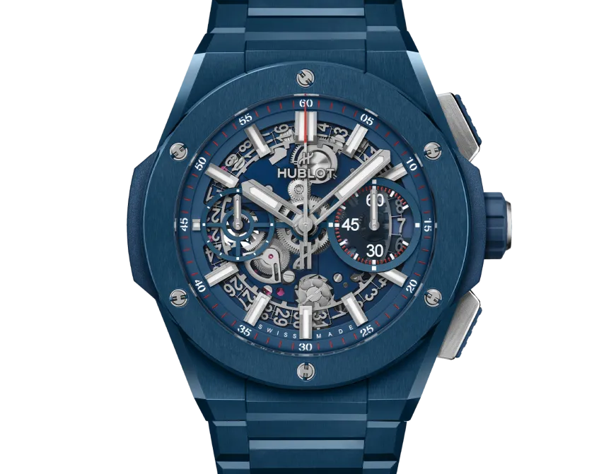 Hublot Big Bang Integrated Blue Ceramic référence 451.EX.5123.EX, HUB1280 UNICO Manufacture Self-winding Chronograph Flyback Movement with Column Wheel, Polished and Satin-finished Blue Ceramic 42mm case, Satin-finished and Polished Blue Ceramic with 6 H-shaped Titanium Screws bezel, 100m or 10 ATM water resistance, Sapphire with Anti-reflective Treatment crystal, Matte Blue Skeleton Dial, Satin-finished and Polished Blue Ceramic Bracelet with Titanium Deployant Buckle Clasp.