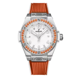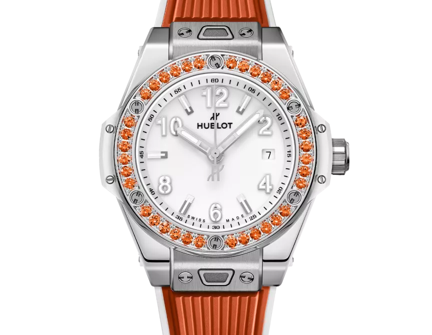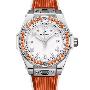 Satin-finished and Polished Stainless Steel 33mm case, polished Stainless Steel Set with 36 Orange Sapphire bezel, Shiny White dial, crystal sapphire with Anti-reflective Treatment. Hublot Calibre HUB1120 Self-winding Movement with a 40-hour power reserve. White and Orange Lined Rubber Strap and Stainless Steel Deployant Buckle Clasp.