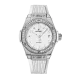 Polished and Satin-finished Stainless Steel, Polished Stainless Steel Set with Diamonds, 100m or 10 ATM water resistance, Sapphire with Anti-reflective Treatment crystal, Matte White Dial, HUB1120 Self-winding Movement, 40 Hours power reserve, White Structured Lined Rubber Straps and Stainless Steel Deployant Buckle Clasp.