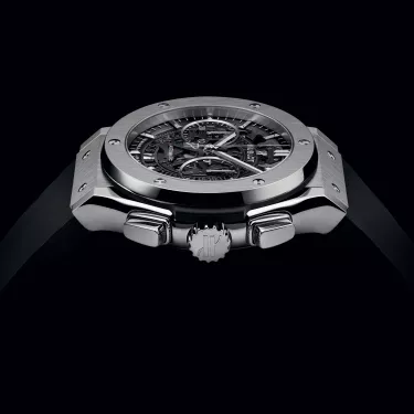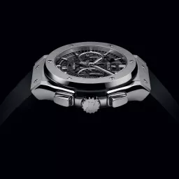 Hublot Aerofusion Titanium 45 mm, Satin-finished and Polished Titanium case, Vertical Satin-finished Titanium with 6 H-shaped Titanium Screws bezel, 50m or 5 ATM water resistance, Sapphire with Anti-reflective Treatment, Sapphire dial, HUB1155 Self-winding Skeleton Chronograph Movement, 42 Hours power reserve, Black Rubber Straps and Stainless Steel Deployant Buckle Clasp.