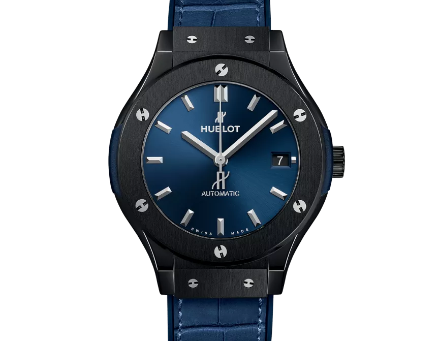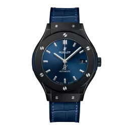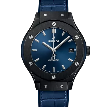 Hublot Classic Fusion Ceramic Blue 38 mm Black ceramic case with a blue alligator leather (rubber backed) strap; Fixed black ceramic bezel; Sunray blue dial; Hublot Calibre HUB1112 Automatic movement and 42 hours power reserve.
