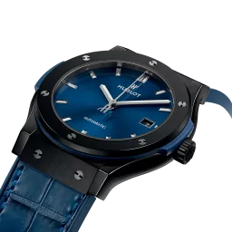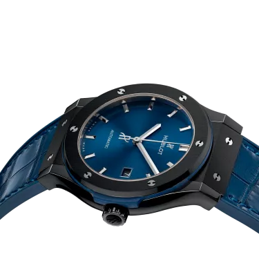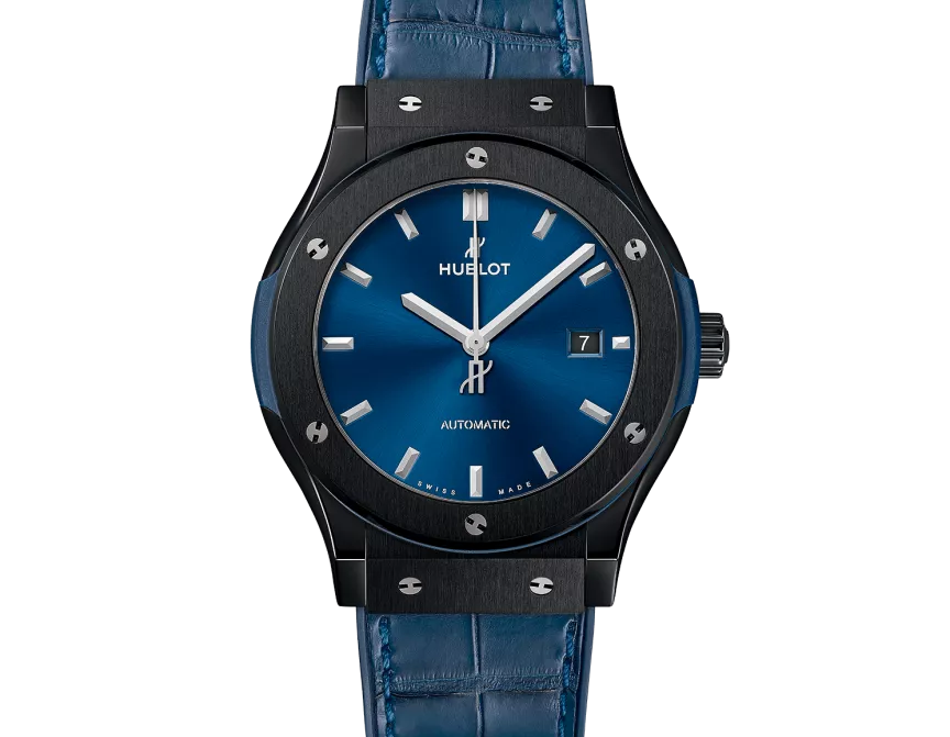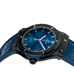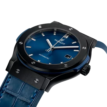 Polished black ceramic case with brushed finished center links between the lugs. Black ceramic bezel with a brushed finished top & polished finished beveled edges, secured with 6 polished "H" style titanium screws. Polished black ceramic crown with rubber tip insert. Blue composite resin "bezel lug" sandwiched between the bezel & case. Blue dial with a fine sunray finish. Applied brushed finished stainless steel "applique" style index hour markers. Polished rhodium plated hands. Hublot Caliber HUB1110, composed out of 63 parts, contains 21 Jewels & has an approximate power reserve of 42 hours.