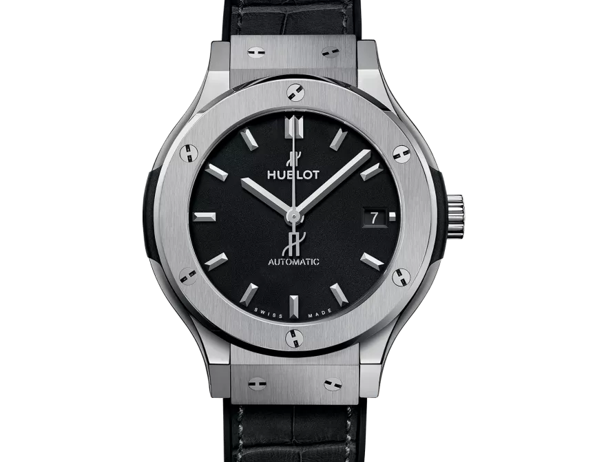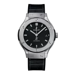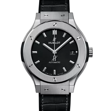 New Hublot Classic Fusion Titanium 38 mm Ref: 565.NX.1470.LR. This superb wristwatch has been designed to be much admired for many years to come. In a satin-finished and polished Titanium case, with matching bezel, the Sunray black dial is beautifully offset by the contrasting hands and hour markers. Black leather strap with folding clasp.