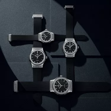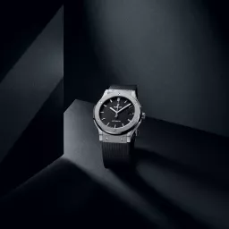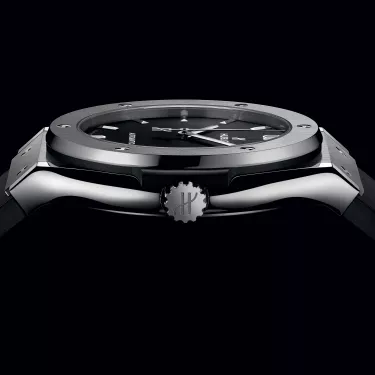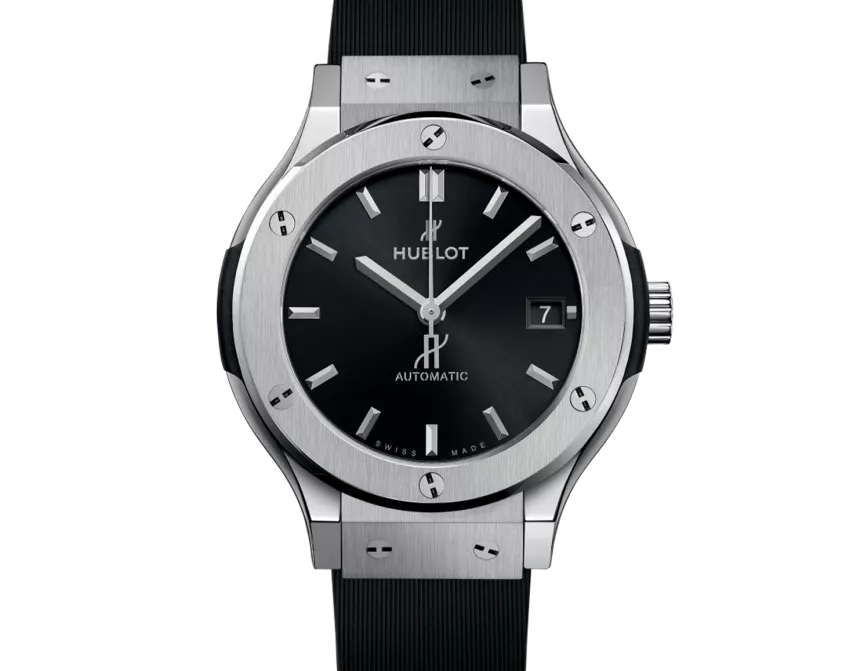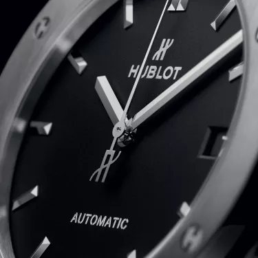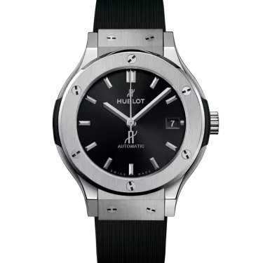 Hublot Classic Fusion Titanium , Satin-finished and Polished Titanium case, Vertical Satin-finished Titanium with 6 H-shaped Titanium Screws bezel, 50m or 5 ATM water resistance, Sapphire with Anti-reflective Treatment, Matte Black Dial, HUB1112 Self-winding Movement, 42 Hours power reserve, Black Lined Rubber Straps and Stainless Steel Deployant Buckle Clasp.